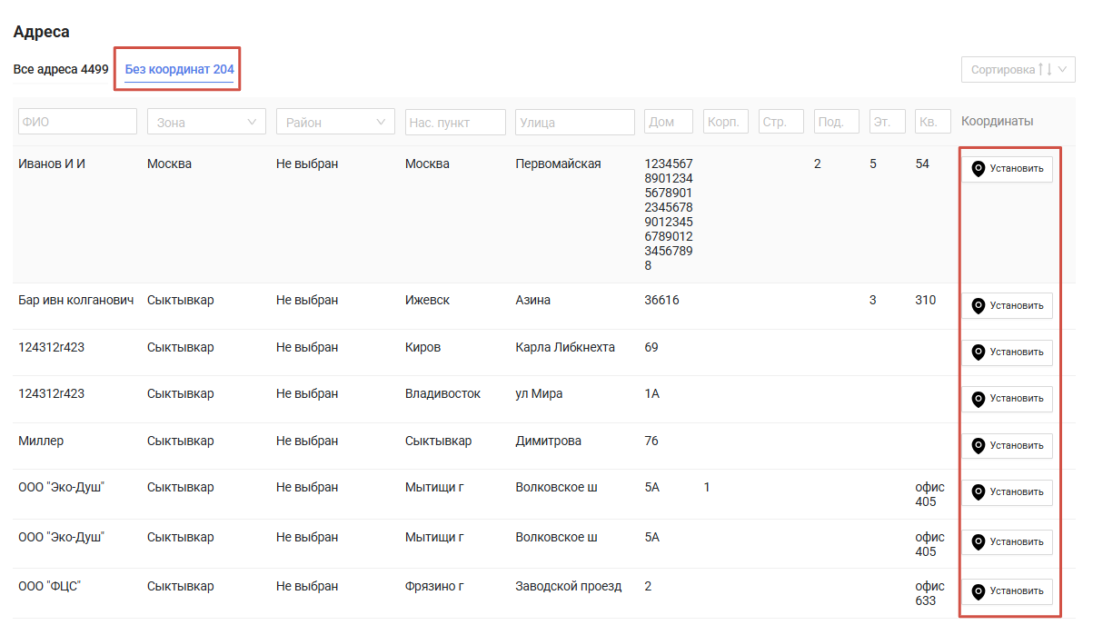 «Адреса без координат» — в данном разделе можно скорректировать неправильно проставленную координату в адресе. (Также в карточке клиента и в карточке заказа есть иконка у каждого адреса, перейдя по которой можно установить координаты).