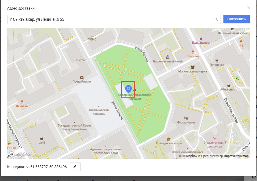 После нажатия на кнопку «Установить» выходит окно с картой, в которой система определяет координаты адреса или дает оператору установить координаты вручную курсором на карте.