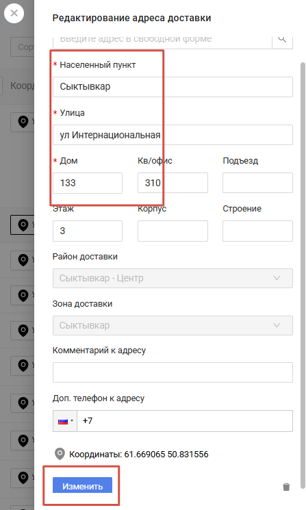 После этого выйдет окно, в котором автоматически подтягиваются: населенный пункт, улица, номер дома. После этого нажимаем кнопку «Изменить». Обязательные поля для заполнения обозначены красной звездочкой.