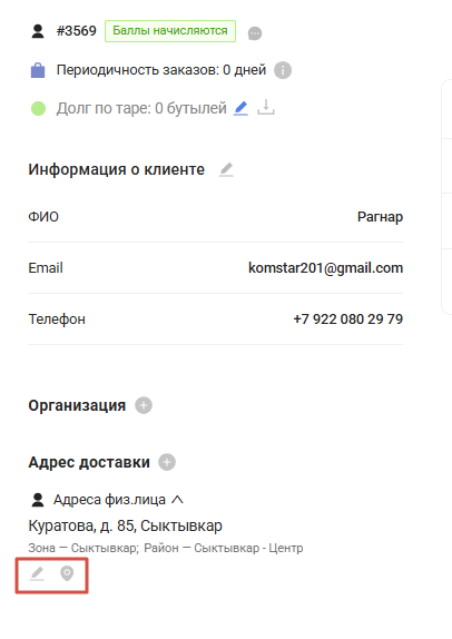 Также в карточке клиента можно просмотреть и отредактировать координаты адреса через символ в виде карандаша.