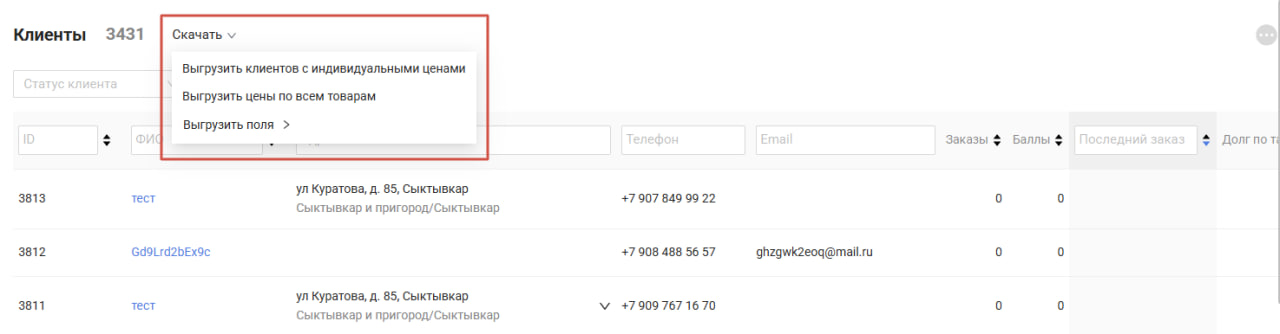 - Выгрузка клиентов с индивидуальными ценами.