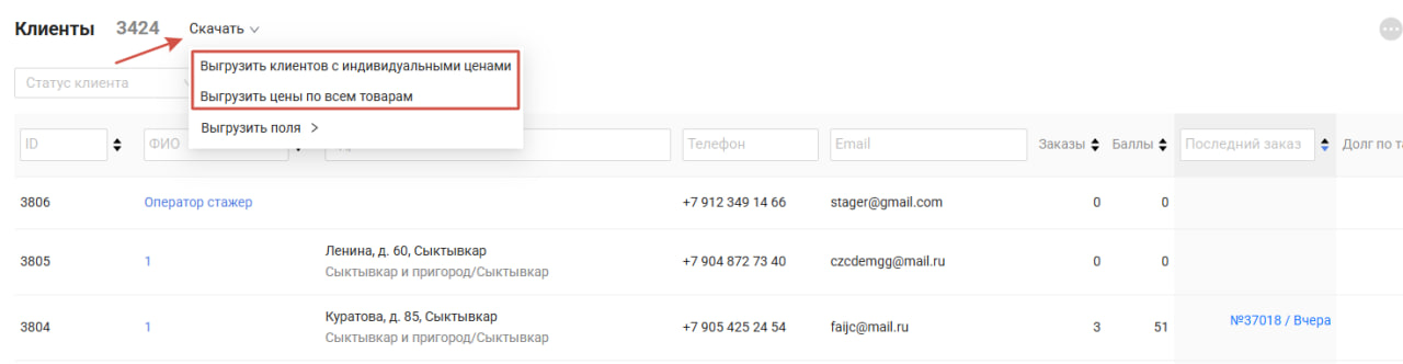 - Выгрузка клиентов с индивидуальными ценами в формате XLS — эта функция позволит вам легко и удобно получить данные о клиентах с их индивидуальными ценами или выгрузить цены по всем товарам в том же формате.