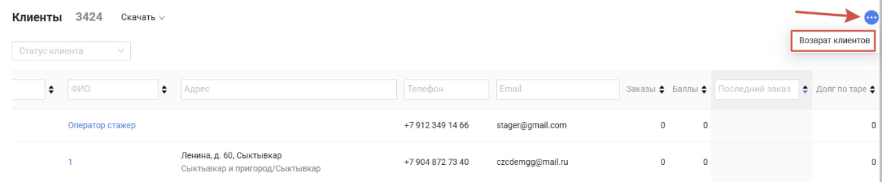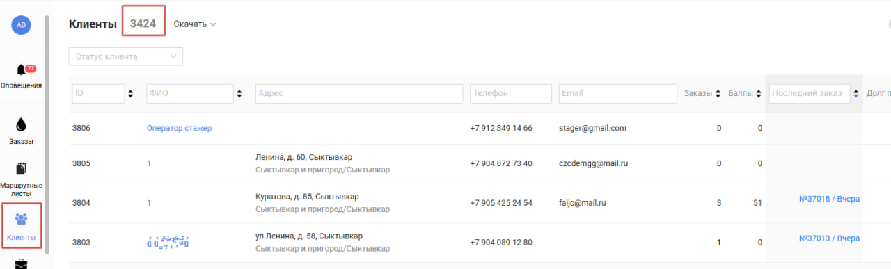 - Просмотр списка клиентов — здесь вы найдете подробную информацию о каждом клиенте. В списке будут указаны ID клиента, ФИО, телефон, email, количество заказов, количество баллов и информация о последнем заказе. При нажатии на последний заказ вы сможете мгновенно перейти в карточку этого заказа. Кроме того, у вас будет возможность сортировать и осуществлять поиск по любым из этих параметров, чтобы легко найти нужную информацию о клиентах.