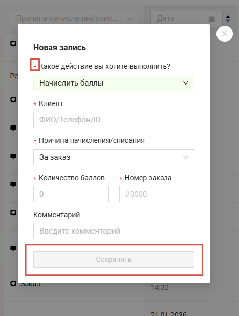 - «Заказ» (необязательно) — если хотите связать начисление баллов с каким-либо заказом. Влияет исключительно на отображение в истории.