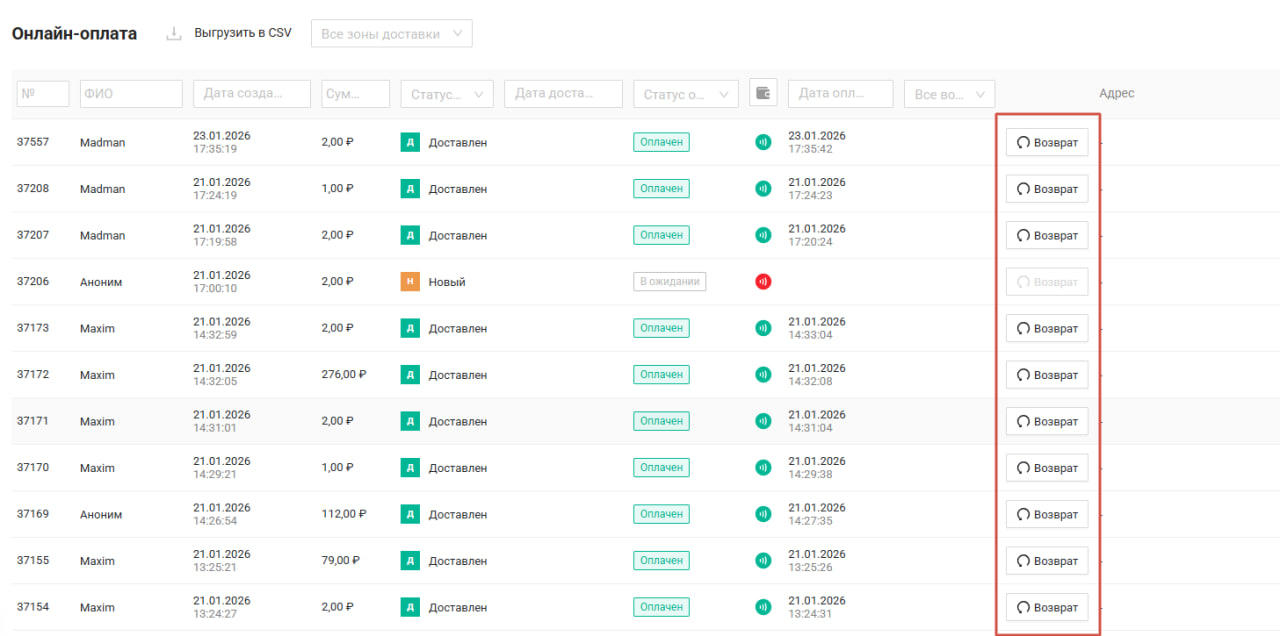 - Кнопка «Возврат оплаты» доступна пользователям с правами администратор. Для пользователя с ролью оператор данный функционал недоступен. Найдите заказ, у которого нужно провести возврат и нажмите на кнопку возврата. !!!Важный момент, если в поле СБП стоит галочка, то возврат средств на данном шаге окончен.