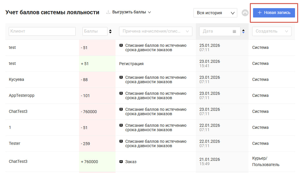Вы также можете списать баллы у клиента — для этого в поле «Значение» введите отрицательную величину, например -100.