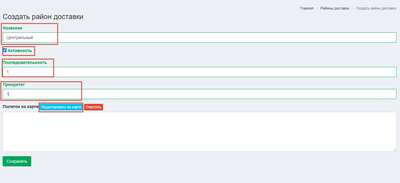 Чтобы создать новый район доставки, выполните следующие шаги: