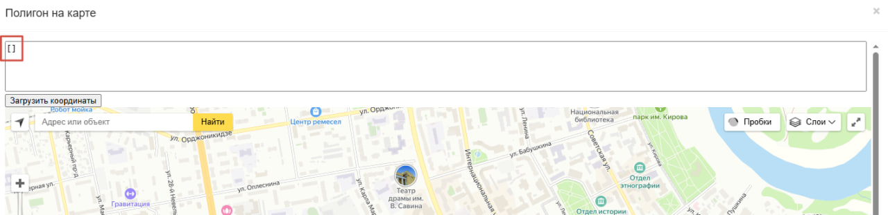 - В открывшемся окне удалите символы «[ ]» и вставьте копированные ранее данные (Сочетание клавиш Ctrl + V), после чего нажмите кнопку «Загрузить координаты». Отобразится ваша зона доставки.