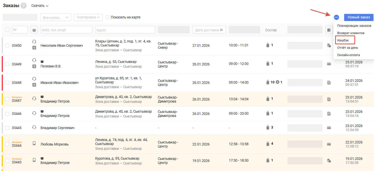- Нажмите на кнопку «Заказы» в боковом меню, чтобы перейти на стол заказов, далее перейдите в раздел «Кешбэк».