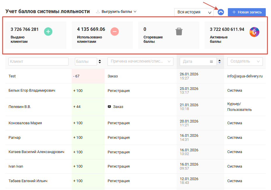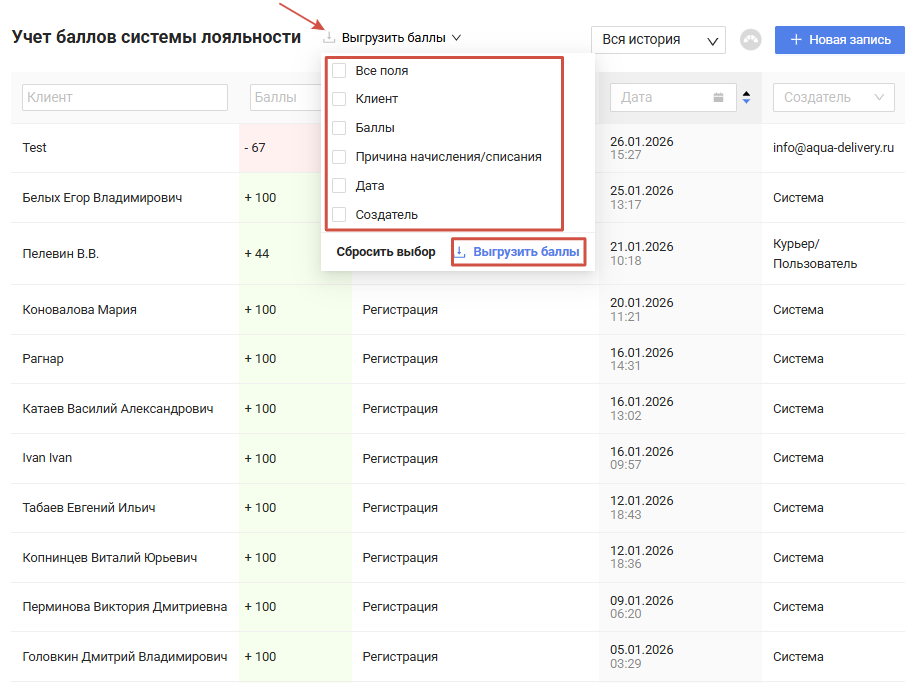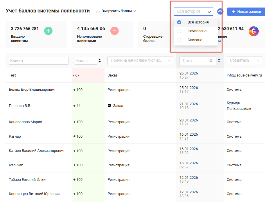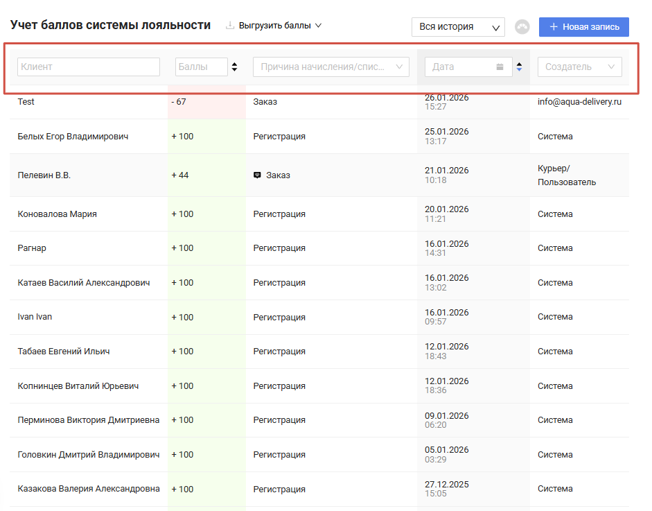 Вводится ФИО клиента, количество баллов списанных или начисленных, причина начисления (за заказ, приглашение в приложение, депозит, регистрация), интересующая дата, создатель (курьер, система, администратор и т. д.).